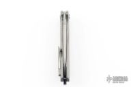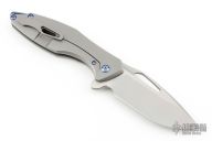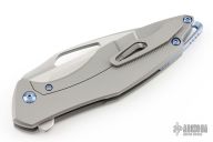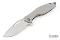 This Arius Flipper by Koenig knives features a brightwashed w/ PF finished blade with thumbhole and flipper. The handle has a bead blasted and C-pattern milled titanium frame with anodized titanium backspacer and a bead blasted tip up clip with hidden screws. Has ceramic bearings and a ceramic detent ball. Nice detent, lockup and blade seating.  Comes with original box and COA dated March 15, 2023.  Excellent condition.