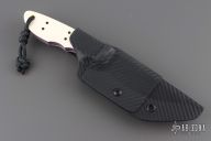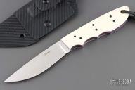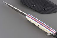 This knife by David Lancaster Clark features a satin finished blade with .136" blade stock and .985" blade depth, full tang construction. The handle has white G-10 scales with red and blue G-10 liners, black G-10 pins. Comes with a kydex sheath with belt loop. New from maker.