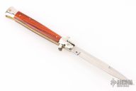 This Swivel Bolster by Latama features a wide (5mm) bayonet ground blade with false top edge. The handle is comprised of nickel silver bolsters and pommel, cocobolo scales, and steel push button/safety over brass liners and steel backspacer. Excellent condition.