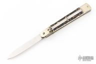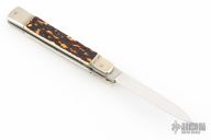 This Slim Line leverlock auto by Hubertus features a high polish blade, nickel silver double bolsters, stag scales, and brass liners and pins. Opens with a nice snap. Very fast opening. Has some scuffs, scratches, and patina. Great condition otherwise.