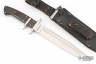This Black Bear Classic by Cold Steel features a satin finished clip point blade with sharpened top edge, 0.196" blade stock and 1.182" blade depth. The handle is comprised of a stainless steel guard and sub hilt with black linen micarta scales and nickel silver pins over full tang construction. Lanyard tube in pommel. Includes leather sheath with stone and belt loop. Has a couple light scratches, otherwise excellent condition.
