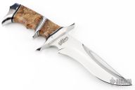 This Custom Black Widow by Bill Luckett features a mirror polished recurve blade with sharpened top edge, .232" blade stock and 1.868" blade depth, hidden tang construction. The handle has a mirror polished stainless steel guard, sub-hilt and butt, stabilized Spalted Maple grip with black, stainless steel and brass spacers. Comes with a zippered case and COA dated 7-28-2013. Excellent condition.