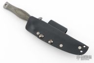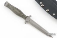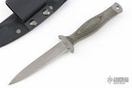This dagger by Barry Dawson features a bead blasted blade with sharpened top edge, .217" blade stock and .735" blade depth, full tang construction. The handle has pinned micarta scales with lanyard hole in pommel. Comes with a black Kydex sheath.  Has some scuffs and scratches, great condition otherwise.