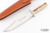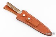 This Bowie marked CK features a polish finished clip point blade with .220" blade stock and 1.541" blade stock, full tang construction. The handle has a steel guard and pinned stag covers. Comes with a leather sheath. Has scuffs, scratches and patina, great condition for its age.