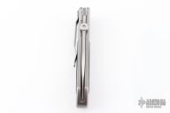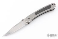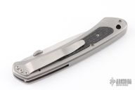 This knife by CJS Chris J. Smith features a satin finished blade with thumbdisc and notched thumbrest. The handle has a bead blasted titanium frame with carbon fiber inlays and a titanium liner and backspacer. Tip down titanium clip. Nice detent, lockup and blade seating. Comes in a zipper case. Excellent condition.