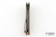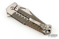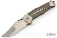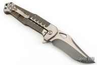This Apollyon my Jim Burke features a chisel ground blade with notched thumbrest, thumbhole and flipper. The handle has a two tone milled titanium frame, copper pivot collars and backspacer and tip up clip, titanium hardware. Rides on bearings, nice detent, lockup and blade seating. Excellent condition. Comes with nylon velcro case.