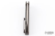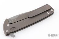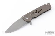 This Phantom by Ferrum Forge features a bead blasted and tumbled drop point blade with flipper. The handle has a bead blasted and anodized titanium frame with hole pattern, tip up matching titanium clip with hidden screws. Nice detent, lockup and blade seating. Comes in a soft pouch. Excellent condition.