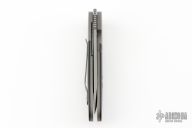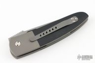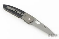 This RTG Tanto by Howard Viele features a bead blasted chisel ground tanto blade with notched thumbrest and a thumbhole. The handle has bead blasted titanium bolsters and liners, black G-10 scales, black linen micarta backspacer, and a tip up stainless steel clip. Nice detent, lockup and blade seating. Comes in a soft pouch, has a couple light scuffs otherwise Excellent condition.
