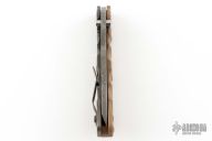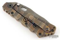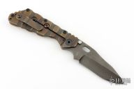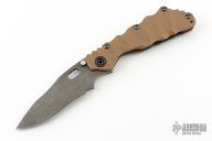 This Duane Dwyer Custom SMF features a Chad Nichols Herring Bone Damascus chisel ground blade with thumbhole and dual studs. The handle has a textured coyote brown G-10 and bronze anodized titanium frame with matching tip up clip. Notches on thumbrest, rear handle, and lockup. Includes Hinderer "Lock Bar Stabilizer" for maximum reverse lock retention. Nice detent, lockup and blade seating. Has scuffs and scratches, otherwise good condition.
