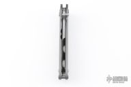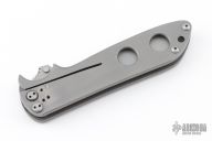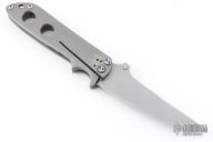 This Folding Fighter by R.J. McDonald features a bead blasted chisel ground blade with sharpened top edge, a checkered thumbstud and notched thumb ramp. The handle has a bead blasted titanium frame. Lanyard hole in pommel. Nice detent and lockup. Comes in a zipper case. Has some scuffs on the handle, otherwise excellent condition.