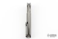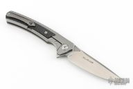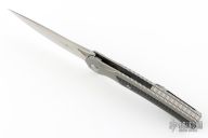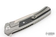This Framelock Flipper by TwoSun knives features a stonewash finished blade with notched flipper. The handle has a milled titanium frame with carbon fiber inlays, a stainless steel lockface insert, titanium tip up clip and backspacer. Rides on bearings, nice detent, lockup and blade seating. Comes with original box. Has a couple light scuffs, otherwise excellent condition.