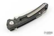 This Linerlock Flipper by TwoSun knives features a satin finished blade with notched flipper and dual thumbstuds. The handle has a milled carbon fiber frame, a stainless steel lockface insert in the titanium liner, titanium tip up clip and backspacer. Rides on bearings, nice detent, lockup and blade seating. Comes with original box. Has a couple light scuffs and scratches, otherwise good condition.