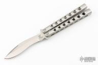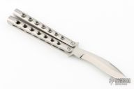 This balisong by 29 Knives features a satin finished blade with false top edge. The handle has integral 303 stainless steel handles. Includes original box, COA and a zippered case. Has a few light scratches on the blade, otherwise excellent condition.