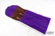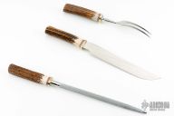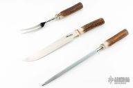"Designed to meet every requirement as the ideal table knife, it is rustproof and will resist staining as ordinary blades do when used in carving meat. Complete with high-quality stag handled Sharpening Steel and Fork. A three-compartment felt case is included. " Satin finished blade with .173" blade stock and 1.206" blade depth, hidden tang construction. Nickel silver guards with stag grips and red/white/blue spacers. Comes with cloth rollup. Excellent condition.