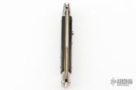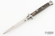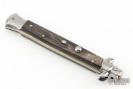 This 11" Swivel Bolster by Frank Beltrame features a mirror finished bayonet ground blade with false top edge. The handle has stainless steel bolsters, front and rear, buffalo horn scales, brass liners and stainless steel spring. Excellent condition.