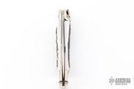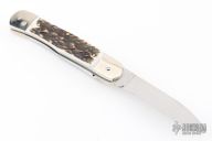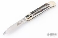 This leverlock auto by Hubertus features a mirror polished blade, nickel silver double bolsters, stag scales, nickel silver liners and brass pins. Opens with a nice snap. Very fast opening. Comes with original box and papers. Has a small nick in the blade edge, otherwise excellent condition.