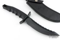 This Black Warrior from Al Mar Knives features a black coated blade with serrated top edge, .235" blade stock and 1.480" blade depth, hidden tang construction. The handle has a black stainless steel double guard, black rubberized handle, and a black stainless steel butt. Comes with original black leather sheath, box and papers. Excellent condition.