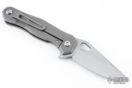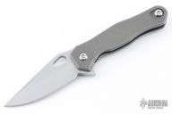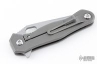 The Quartermaster "Mr. Roper" has a clip point tumbled blade. Jimping on the spine near the handle improves grip. The handle is made of tumbled titanium. Titanium pocket clip is tip up carry. Has some light scuffs, excellent condition.