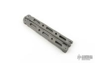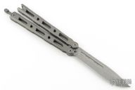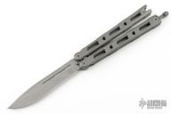 This Model 85 Balisong by Benchmade features a tumble finished blade. The handle has an integrally constructed, skeletonized titanium frame with bead blast finish. Spring-loaded T latch on pommel. Comes with original box, papers and slip sheath. Excellent condition.
