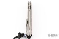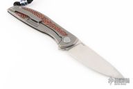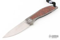 This Neon NL by Shirogorov features tumbled blade with notched thumbrest and flipper. The handle has a tumbled titanium frame with crazy micarta inlays. Comes with original box, papers, and attached bead. Has scuffs and scratches, great condition otherwise.