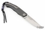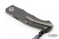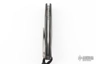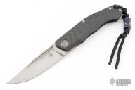 This Pero Flipper by Shirogorov and Dmitry Sinkevich features a matte finished clip point blade with fullers, notched thumbrest and flipper. The handle has a carbon fiber frame, inlaid titanium liner with stainless lockface insert and ceramic detent, matte finished titanium backspacer and tip up clip with hidden screws. Has MRBS. Comes with the wrong Shiro box and card. Has a couple light scuffs, excellent condition otherwise.