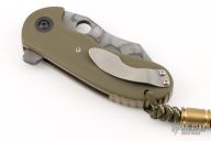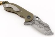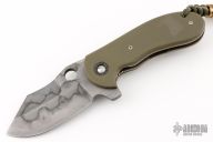 This framelock flipper from Burchtree Bladeworks features a hand rub satin finished blade with hamon and thumbhole. The handle has OD G10 scales, carbon fiber pivot collars, bronzed orange peel titanium liners with bead blast finished tip up clip, matching bronzed backspacer. Nice detent, lockup and blade seating. Has some patina and spots on the blade, great condition otherwise.