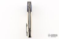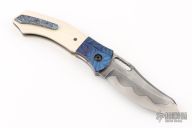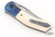 This Knook by Chuck Gedraitis features a clip point blade with hamon, swedge, and thumbhole. The handle has blued mosaic Damascus bolsters and tip up clip with hidden screws, ivory G10 scales, linen micarta back spacer, and orange peel finished titanium liners. Nice detent, lockup and blade seating. Comes with a zipper case. Has some light scuffs and scratches, excellent condition otherwise.