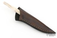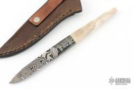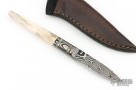 This Integral Utility by Lucas Wojakevicz features a Damascus blade with integral guard and pirita stone spacers, .136" blade stock and .627" blade depth, hidden tang construction. The handle has a ground stag grip. Comes with a brown leather sheath and zippered case. New from maker!