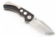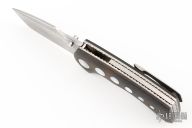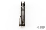 This linerlock by Todd Fischer features a polished satin San-Mai blade, dual thumbstuds with inlaid pearl and polished blade spine. The handle has wood scales with pearl inlays, satin finished titanium liners, with file worked spine, pearl double pivot collars with inlays, San-Mai backspacer and titanium tip up clip. Nice detent, lockup and blade seating, rides on bearings. Comes with a zippered case. Has some light scuffs and scratches, great condition otherwise.