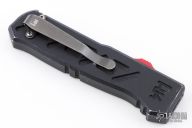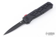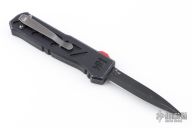 This Epidemic OTF was made by Benchmade for Heckler and Koch. It features a black spear point blade with false top edge. The handle hasa black machined aluminum chases with a tip down carry pocket clip. Has scuffs and scratches otherwise the knife would make a good user.