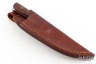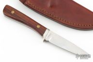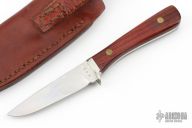 This Knife by Daniel Cannady features a mirror polished drop point blade, .138" blade stock and .842" blade depth, full tang construction. The handle has a steel guard with wood scales.  Includes a brown leather sheath.  Has scuffs/scratches otherwise the knife would make a good user.