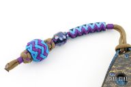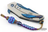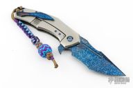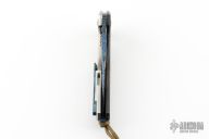 This Gladius 2 by Robert Oldaker features a high satin polished blued Reitveld Damascus clip point recurve blade with notched thumbrest, fullers and flipper. The handle has gold carbon fiber scales, matching Damascus tip up clip with hidden screws, matching backspacer with lanyard hole, Damascus pivot collars, anodized titanium hardware, stainless lockface insert. Lockside is satin finished titanium. Nice detent, lockup and blade seating. Comes with zippered case. Has some scuffs and scratches, great condition otherwise.