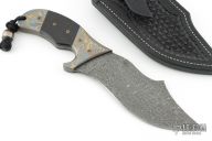 This Persian Fighter by Rob Oldaker features a Nichols Intrepid Damscus clip point, recurve blade with a swedge, full tang construction, .172" Blade Stock, and 2.214" Blade Depth. The handle is comprised of Blackwood carbon fiber scales, and Nichols bronze zirconium front/rear bolsters. Comes with a zipper case and COA. Has a couple light scuffs, excellent condition otherwise.