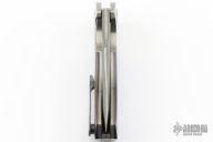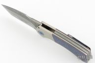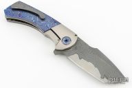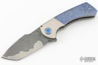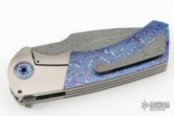 This bolster lock by Todd Fischer features a polished satin San-Mai Damascus blade, with notched flipper tab. The handle has satin finished titanium bolsters, double mokuti pivot collars, and scales, with floating San-Mai backspacer and matching San-Mai tip up clip. Nice detent, lockup and blade seating, rides on bearings. Comes with a zippered case. Has some light scuffs and scratches, great condition otherwise. Signed in the back spacer.