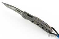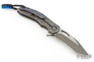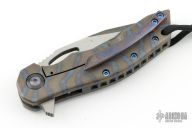 This knife by Robert Oldaker features a two-tone recurve blade with notched thumbrest and flipper. The handle has a flamed titanium frame with matching notched backspacer and Mokuti tip up clip. Nice detent, lockup and blade seating. Comes with a zipper case. Has some scuffs and scratches, excellent condition otherwise.