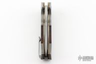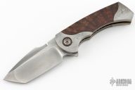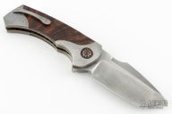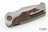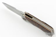 This linerlock by Todd Fischer features a polished satin San-Mai blade, notched flipper tab and polished blade spine. The handle has Damascus front/rear bolsters, wood inlays, double pivot collars with inlays, floating San-Mai backspacer and Damascus tip up clip. Nice detent, lockup and blade seating, rides on bearings. Comes with a zippered case. Has some light scuffs and scratches, has some oxidation spots on the blade and bolsters, great condition otherwise.