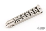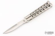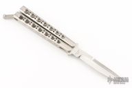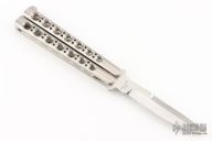 This early balisong from Pacific Cutlery features a Jody Samson ground satin finished blade with sharpened top edge. The handles are stainless steel with hole pattern. Comes in nylon belt sheath "cacoon TM" By Bali-Song Inc. Has a couple light scratches, excellent condition otherwise. Very nice for its age!