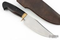 This Bowie by ABS Apprentice Tony Mont features a hand rub satin finished blade with a nearly sharpened top edge, .159" blade stock and 1.900" blade depth, hidden tang construction. The handle has a brass guard with an African Blackwood grip and a brass pin. Comes with a brown leather sheath. Excellent condition.