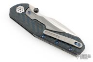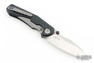 This knife by Zero Tolerance is a Sinkevich/Rexford Design, it features a two-tone CPM 20CV blade with tumbled flats and satin grinds, notched thumbrest and thumb lug. The handle has black/blue carbon fiber frame with a bead blasted titanium lockbar and tip up clip, bead blasted and darked titanium backspacer. S/N 1937. Comes in a ZT box, wrong label. Has some light scuffs and scratches, excellent condition otherwise.
