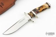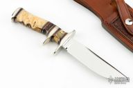 This Sub-Hilt Fighter by Randy Lee features a mirror polished blade with .216" blade stock and 1.231" blade depth, hidden tang construction. The handle has a nickel silver guard, sub-hilt and butt, California Buckeye Burl with amber resin filler, and a spacer pattern consisting of black/nickel silver/Desert Ironwood/black magic resin. Comes with a hand tooled brown leather sheath, zippered case and COA. New from maker.
