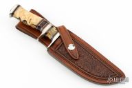Randy’s fascination with knives began as a young man when he made his first knife in a high school “metals” class. He collected them for years and eventually began making his own to get a better edge-holding skinner for hunting. Randy read books and visited local makers to learn the craft. In 1979, he decided to invest in shop equipment so that he could properly master his knife making skills. In a few years, he was making and selling knives to local hunters, while continually developing his style and craftsmanship. He attended his first knife show in 1986 and has been participating in about six shows each year since then. As an avid hunter, Randy knows how a good hunting knife should perform. He loves to “field-test” his designs and feels that a quality knife should not only look great, but perform well as a tool. He offers a wide variety of knife styles; from utility hunters and fighters to collector pieces such as daggers and bowies. Although the actual work of grinding and buffing knives is very tedious, he always finds it rewarding to see the final finished product. Randy particularly enjoys meeting people who find knives as interesting and exciting as he does. Randy’s wife, Sonja Lee, is one of the premier sheath makers in the business. Using exotic hides, or leather and various forms of tooling, she has mastered the craft of sheath making. Sonja creates the custom sheaths which are provided for each of Randy Lee’s knives and she is now making custom sheaths for many other knife makers and collectors.