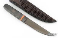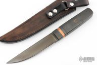 This Kwaiken by Attila Kertesz has a black DLC coated blade with hidden tang construction, .201" blade stock and 1.110" depth. The handle has black DLC coated steel guard with a copper spacer, carbon fiber grip with a copper pin. Comes with a hand tooled brown leather sheath. "ULTRA APEX" on the ricasso, which is the blade steel used. New from maker.