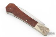 This lockback folder by Mel Pardue features a hand rub satin finished blade. The handle has engraved nickel silver bolsters, wood scales, nickel silver liners, stainless steel backspacer. Nice lockup and blade seating. Has a couple light scratches, otherwise excellent condition.