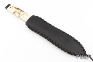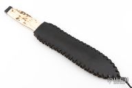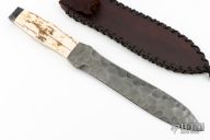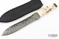 This "Mammoth" Dagger by Attila Kertesz has a blackened flint knapped style blade with integral bolsters, .348" blade stock and 1.750" depth, full tang construction. The handle has Mammoth ivory scales with hidden pins. Has anodized titanium inlays in the butt and on both sides of the ricasso. Comes with a black leather sheath. New from maker.