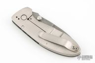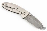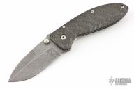 This Alpha framelock by Tom Krein features a stonewash finished spear point blade with dual thumbstuds and a false top edge. The handle has a carbon fiber and orange peel finished titanium frame and a matching tip up or down reversible pocket clip, orange peel finished titanium backspacer. Nice lock up, detent and blade seating. Includes a zippered case. Excellent condition. Dated 2012