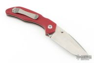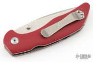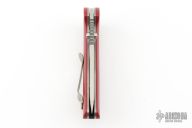 This Pulsar by Jesse Jarosz features a two-tone drop point Super Gold SG2 blade with swedge, dual thumb studs and notched thumbrest. The handle has red G-10 scales over tumbled titanium liners and black G-10 backspacer with recessed lanyard pin. The tumbled titanium tip up clip is reversible for right or left hand carry. Nice blade seating, detent and lock up. Has a few light scuffs, otherwise excellent condition. Comes with COA #555. Comes with a zippered case.
