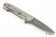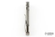 This Kumu by Defiant 7 features a Damascus blade with flipper. The handle has a stonewashed titanium frame with matching backspacer and tip up clip. Rides on bearings, nice detent, lockup and blade seating. Excellent condition.