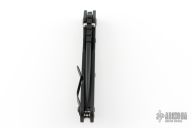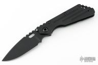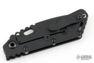 This Mick Strider Performance Series SMF framelock folder features a black finished spear point blade with thumbhole and notched thumbrest. The handle has a black titanium frame with titanium clip, tip up carry. Jimping on blade spine. Includes Hinderer "Lock Bar Stabilizer" for maximum reverse lock retention. Nice detent, lockup and blade seating. New condition.