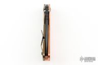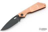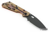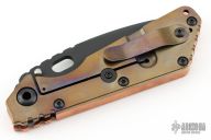 This Mick Strider SMF framelock folder features a black finished spear point blade with thumbhole and notched thumbrest. The handle has a copper and orange peel finished anodized titanium frame with titanium clip, tip up carry. Jimping on blade spine. Includes Hinderer "Lock Bar Stabilizer" for maximum reverse lock retention. Nice detent, lockup and blade seating. New condition.