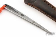 Hand forged by Ryan Johnson at the Gold Point Forge! The Thistle from Ryan is a handy small and discreet EDC companion, that is light enough to carry all day while still being substanial and easy to use. The shaft features a catacombs motif that adds a killer look while also providing a bit of extra traction. The triangular needle like point is perfect for when you need to mark, pry or poke a hole in somthin'! Added cordage on the back to aid in ease of deployment. Comes with a custom leather sheath with IWB clip and finished with Ryan's homemade dye concoction. Note: Each is hand made start to finish. There might be slight differences in dimensions and patterns. Just know yours is unique!
